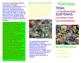 La biodiversidad o diversidad biológica es la amplia variedad de seres vivos en la Tierra, incluyendo las especies, razas y ecosistemas. Surge de miles de millones de años de evolución y de la influencia humana. La Cumbre de la Tierra de 1992 reconoció la necesidad de preservar la biodiversidad de forma sostenible mediante el Convenio sobre la Diversidad Biológica.