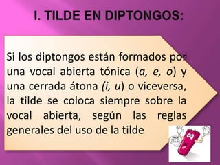 Este documento explica las reglas ortográficas para el uso de la tilde en diptongos, hiatos y triptongos en palabras del español. Indica que la tilde siempre se coloca sobre la vocal abierta en diptongos y que los hiatos y triptongos llevan tilde de acuerdo a las reglas generales de acentuación, colocándola sobre la vocal abierta en estos casos. También proporciona ejemplos para ilustrar cada tipo de combinación vocálica.