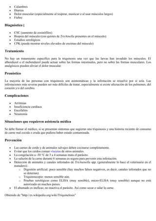La triquinelosis es una enfermedad parasitaria causada por nematodos del género Trichinella que se adquiere al consumir carne cruda o poco cocinada de animales infestados. Los síntomas incluyen diarrea, dolor muscular y articular. El parásito se enquista en los músculos de animales como cerdos y osos silvestres. Las personas se infectan al ingerir la carne infestada, donde las larvas maduran en el intestino y luego migran a los músculos, causando síntomas. La prevención