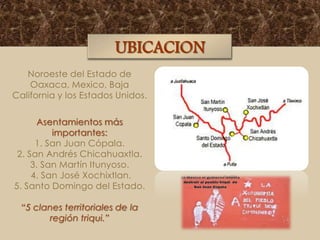 Los triquis son un pueblo indígena que habita en el noroeste del estado de Oaxaca y partes de Baja California y Estados Unidos. Hablan el idioma triqui y practican una agricultura de subsistencia basada en el maíz, frijol y otros cultivos. Mantienen tradiciones culturales como danzas, música, artesanías y festividades religiosas, aunque también han adoptado elementos de otras culturas. Han sufrido despojo de sus tierras por parte de mestizos y mixtecos, lo que ha generado tensiones é