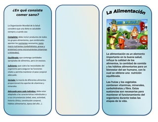 La alimentación equilibrada es fundamental para mantener una buena salud. Los alimentos proporcionan los nutrientes necesarios como proteínas, grasas, vitaminas y minerales para realizar funciones vitales y mantener el cuerpo. Una dieta saludable debe ser completa, equilibrada, suficiente y variada para cubrir las necesidades individuales y aportar los nutrientes esenciales como las vitaminas y minerales presentes en frutas y verduras.