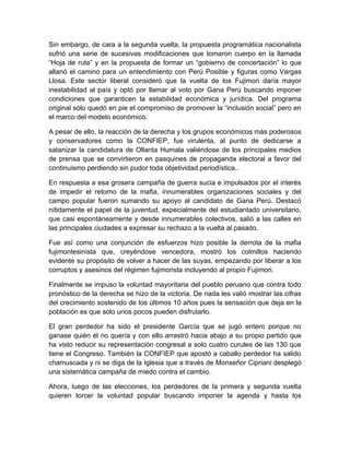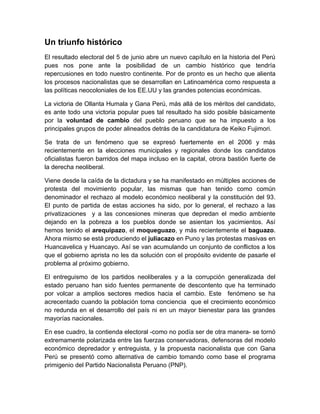 El documento resume el triunfo histórico de Ollanta Humala en las elecciones peruanas como una victoria del pueblo peruano que rechaza el modelo neoliberal y desea un cambio. Explica que el pueblo se ha movilizado en contra de las privatizaciones y a favor de demandas sociales. A pesar de modificaciones al programa original, el triunfo representa la esperanza de cambio y la oportunidad de una nueva constitución que ponga los recursos naturales al servicio del pueblo peruano.