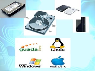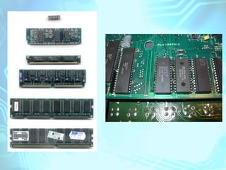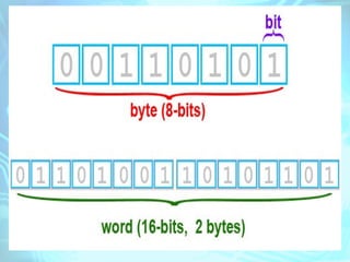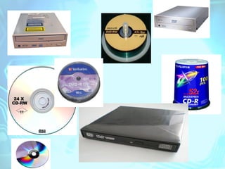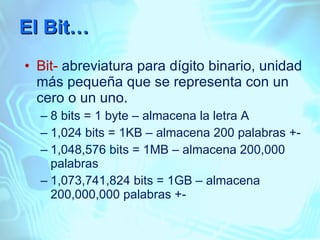 El documento define varios términos relacionados con componentes de computadoras, incluyendo el bit, byte, CD, DVD, disco duro, RAM, ROM, USB y puertos. Explica que un bit es la unidad más pequeña de información, 8 bits = 1 byte, y que dispositivos como CDs, DVDs y discos duros se miden en megabytes y gigabytes para indicar su capacidad de almacenamiento. También define la CPU como la unidad central de procesamiento y el sistema operativo como el software que hace funcionar la computadora.