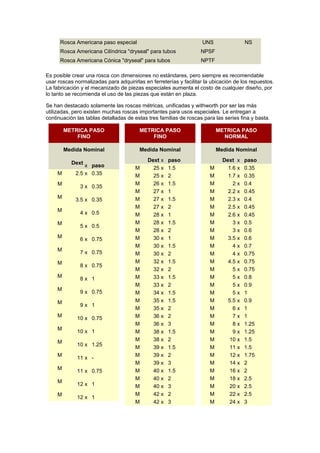 El documento describe diferentes tipos de roscas de tornillo, incluyendo roscas externas e internas, sus diámetros mayores y menores, y varios estándares comunes de roscado como métrico, unificado y Whitworth. También proporciona tablas detalladas de las dimensiones de las roscas para estas tres familias estándar.