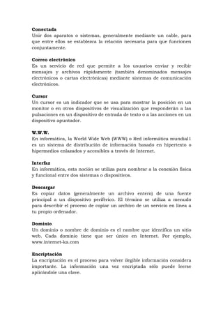 Este documento define varios términos relacionados con Internet y la tecnología web. Incluye definiciones de acceso, avatar, y explorador, que se refieren a la autenticación de usuarios, las representaciones gráficas de usuarios, y los navegadores web respectivamente. También define términos como bits, hipertexto, y enlaces que son componentes fundamentales de la World Wide Web.