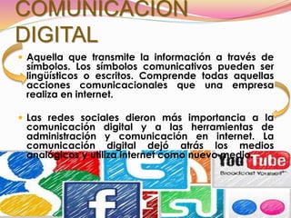 El documento resume conceptos clave de la comunicación digital como hipertexto, interactividad, multimedia, redes sociales digitales, blogs, periodismo digital, contenido web y formatos de imágenes digitales. También explica términos como página web, sitio web, URL, lenguaje HTML, enlaces, podcasts y wikis.