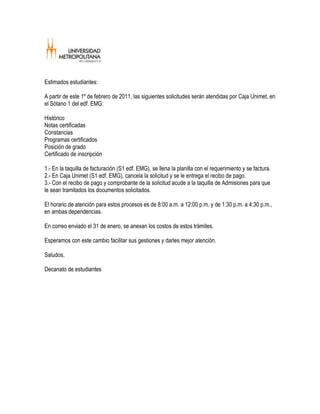 A partir del 1 de febrero de 2011, los estudiantes podrán solicitar documentos como historial académico, notas certificadas, constancias y certificados en la Caja Unimet en el sótano 1 del edificio EMG. Para obtener los documentos, los estudiantes deben llenar una planilla en la taquilla de facturación, cancelar la solicitud en Caja Unimet y presentar el recibo de pago en Admisiones. El horario de atención es de 8:00 a.m. a 12:00 p.m. y de 1: