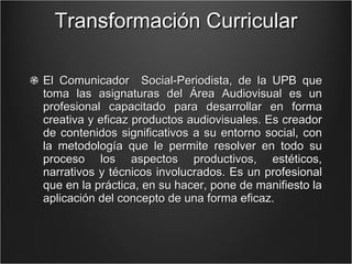 El documento propone una transformación curricular del área audiovisual de la UPB. Plantea que los estudiantes del área deben ser capaces de crear, producir y analizar contenidos audiovisuales de manera creativa y con un enfoque técnico y conceptual. También propone reorganizar las asignaturas de la ruta de imagen para dar mayor coherencia a la malla curricular.