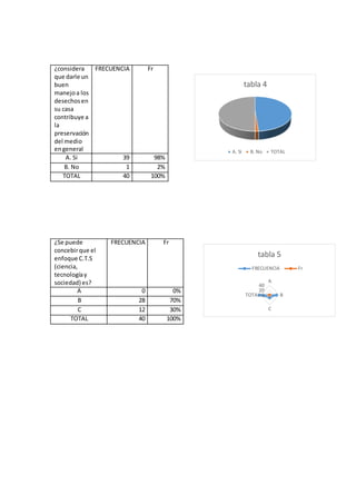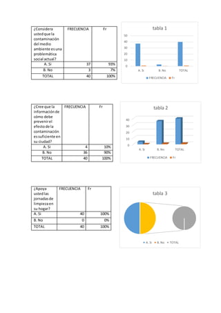 El documento presenta los resultados de 4 encuestas realizadas a 40 personas sobre temas relacionados con la contaminación y el medio ambiente. La mayoría de los encuestados considera que la contaminación es un problema actual (37 personas) y apoya las jornadas de limpieza en su hogar (40 personas). Sin embargo, la mayoría cree que la información sobre cómo prevenir los efectos de la contaminación en su ciudad es insuficiente (36 personas). Casi todos (39 personas) consideran que darle buen manejo a los desechos en su casa contribuye a la preservación del med