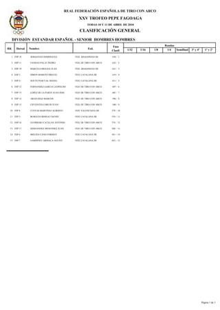 Este documento presenta los resultados de la XXV edición del Trofeo Pepe Fagoaga de tiro con arco, que tuvo lugar los días 10 y 11 de abril de 2010. Se clasificaron 15 arqueros españoles y 12 arqueros extranjeros en la división estándar para hombres, así como 4 arqueras españolas y 3 arqueras extranjeras en la división estándar para mujeres. Sebastián Domínguez de la Federación Aragonesa de Tiro con Arco ganó la competición masculina española, mientras que Lucía Hernández D