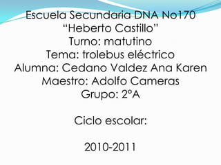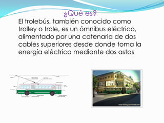 El trolebús es un ómnibus eléctrico que obtiene su energía de una catenaria de cables. Su historia comenzó en 1882 y se desarrolló en las primeras décadas del siglo XX como alternativa entre tranvías y autobuses. Ofrece ventajas como menor contaminación y capacidad intermedia de pasajeros, aunque depende de las líneas eléctricas y tiene mayor resistencia que los tranvías.