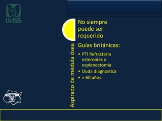 Este documento clasifica y describe las trombocitopenias, sus causas fisiopatológicas, diagnóstico y tratamientos. La púrpura trombocitopénica inmunológica es un tipo de trombocitopenia causada por anticuerpos contra las plaquetas. Los tratamientos incluyen prednisona, inmunoglobulina endovenosa y esplenectomía. Nuevos tratamientos como fenoximetilprednisolona buscan mejorar la morbilidad y mortalidad asociada a la cirugía.
