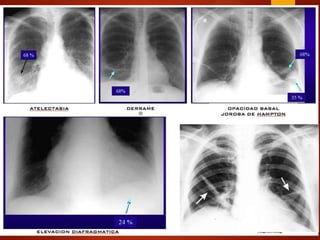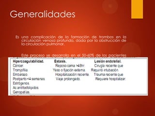 La tromboembolia pulmonar ocurre cuando un coágulo de sangre se desprende y bloquea la circulación pulmonar, lo que puede causar complicaciones como oligohemia, aumento de la arteria pulmonar, pérdida de volumen pulmonar, atelectasia e infarto. Para que ocurra, deben darse tres factores: estasis venosa, daño al endotelio vascular e hipercoagulabilidad. La radiología puede detectar signos como derrame pleural y embolismo pulmonar, mientras que exámenes como la