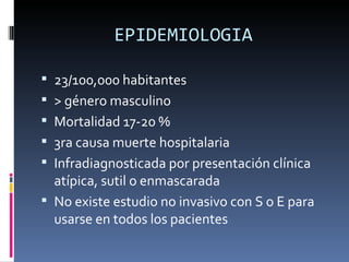 El documento describe la epidemiología, patogenia, fisiopatología, factores de riesgo, diagnóstico y tratamiento de la tromboembolia pulmonar (TEP). La TEP ocurre más en hombres y es la tercera causa de muerte hospitalaria. El 90% de los émbolos pulmonares provienen de trombos venosos profundos en las piernas. El diagnóstico incluye análisis de sangre, tomografía computarizada del pecho, electrocardiograma y ecocardiograma. El tratamiento consiste en