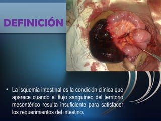 La isquemia mesentérica aguda se produce cuando el flujo sanguíneo al territorio mesentérico es insuficiente para satisfacer las necesidades del intestino. Las causas más comunes son la embolia arterial y la trombosis arterial o venosa. Los síntomas incluyen dolor abdominal, distensión y vómitos. El diagnóstico se basa en pruebas de imagen como TAC o angiografía y el tratamiento requiere reperfusión quirúrgica o médica urgente para prevenir la muerte del tejido intestinal.