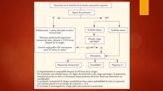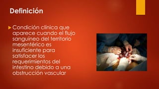 III. El diagnóstico se basa en el dolor abdominal intenso, exámenes de laboratorio como la leucocitosis y dímero-D elevados, y pruebas de imagen como la tomografía computarizada o angiograf