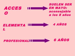 El documento habla sobre la educación musical para convertirse en un maestro de la trompeta. Recomienda comenzar a los 8 años de edad con clases elementales de 4 años, seguidas de 6 años de estudios profesionales que incluyen asignaturas como instrumento individual, instrumento colectivo, lenguaje musical y coro. También proporciona enlaces a videos de ejemplos y una lista de fuentes de información.