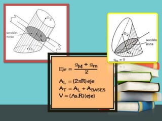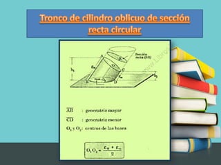 El documento describe la evolución del artista Javier Carvajal de usar el plano como objeto de investigación estética a enfocarse en el cilindro. Explica que ha creado formas complejas guiado por la lógica de los movimientos y la búsqueda de la belleza. Luego presenta algunas definiciones matemáticas y propiedades geométricas del cilindro y el tronco de cilindro, incluyendo fórmulas para calcular su volumen, área y variaciones respecto al radio y la altura.