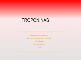 El examen de troponinas mide los niveles de las proteínas troponina T y troponina I en la sangre, las cuales se elevan cuando hay daño al músculo cardíaco. Se realiza mediante una muestra de sangre y puede sentirse un ligero dolor. El examen se usa principalmente para diagnosticar infartos al miocardio al elevarse los niveles de troponinas luego de 6-12 horas de daño cardíaco. También puede estar elevado por otras afecciones que causen lesión cardiaca.