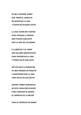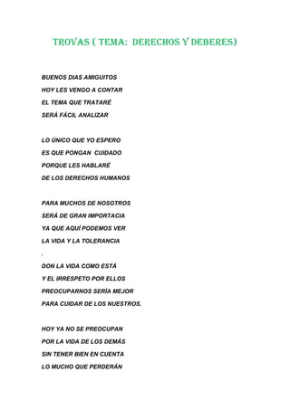El poema habla sobre los derechos y deberes humanos, explicando que todos tenemos derecho a la vida, la libertad y el amor, y el deber de respetar esos mismos derechos en los demás. También enfatiza la importancia de tomar conciencia sobre estos temas y pensar en el impacto de nuestras acciones en la vida de los demás.