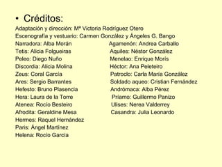 Este resumen describe una obra de teatro escolar sobre la guerra de Troya. La obra presenta los eventos clave de la guerra, incluyendo las bodas de Peleo y Tetis donde Eris deja su manzana de la discordia, Paris eligiendo a Afrodita y ganando el amor de Helena, el inicio de la guerra entre griegos y troyanos, la muerte de Héctor a manos de Aquiles, y el caballo de Troya que condujo a la caída de la ciudad. La obra termina con los griegos y troyanos saludando