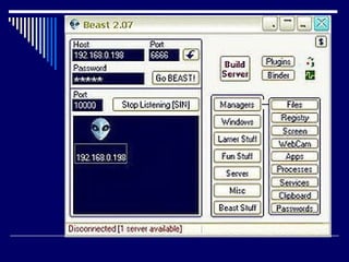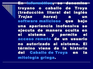 Un troyano es un software malicioso que se ejecuta de forma oculta en un sistema para permitir el acceso no autorizado. Los troyanos no se propagan a otros sistemas por sí mismos y necesitan instrucciones de un individuo. Pueden usarse para robar información, modificar archivos, ejecutar procesos y más. Es difícil detectarlos y eliminarlos manualmente, por lo que se recomienda usar antivirus actualizados.