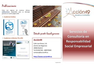 Acción49 ofrece servicios de consultoría en responsabilidad social empresarial, promoviendo la integración de prácticas sostenibles en la gestión empresarial. Buscan contribuir al desarrollo social positivo mediante el diálogo y la transparencia, apoyando a las empresas en la implementación de modelos estratégicos de responsabilidad. Su equipo está compuesto por profesionales con experiencia en el sector, orientados a desarrollar programas que generen valor tanto para los negocios como para la sociedad.
