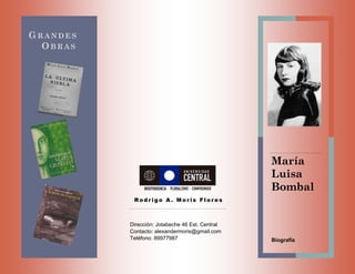 Rodrigo A. Moris Flores ofrece servicios de construcción y remodelación. Su contacto es alexandermoris@gmail.com y su número de teléfono es 89977987. La biografía presenta a María Luisa Bombal, escritora chilena nacida en 1910 en Viña del Mar que se mudó a París a los 8 años tras la muerte de su padre y estudió literatura en La Sorbona. Regresó a Chile en 1928 y conoció a Eulogio Sánchez Errázuriz con quien inició una relación amorosa.