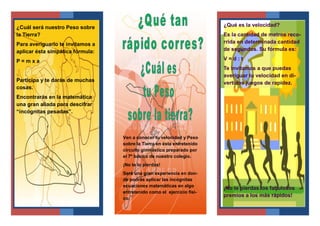 El documento invita a estudiantes a participar en juegos y circuitos que permitirán calcular su peso, velocidad y fuerza aplicando fórmulas matemáticas de manera entretenida. Los estudiantes podrán competir por premios participando en diversas actividades como carreras, ejercicios de fuerza y circuitos gimnásticos diseñados para medir y aplicar conceptos como masa, distancia, tiempo y ecuaciones relacionadas.