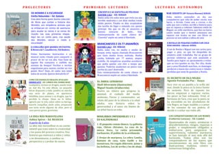 El documento presenta varios resúmenes de libros infantiles y juveniles. Entre ellos se encuentran historias sobre viajes en tren, misterios por resolver, aventuras en el mar, cuentos clásicos reinterpretados y libros que fomentan la creatividad y la superación de dificultades. El documento también incluye información sobre la biblioteca a la que pertenecen los libros y recomendaciones de lectura para las fiestas navideñas.