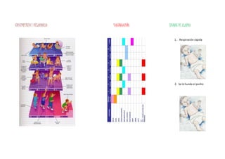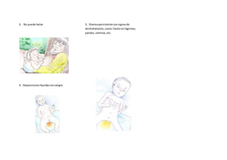 Los signos de alarma incluyen respiración rápida, pecho hundido, incapacidad de lactar, deposiciones líquidas con sangre y diarrea persistente con señales de deshidratación como llanto sin lágrimas, palidez y vómitos.