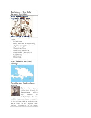 El documento describe la situación política y económica de la Segunda República Dominicana de 1865 a 1879. Políticamente, la guerra restauradora provocó la fragmentación del país y el surgimiento de caudillos regionales que lucharon entre sí por el control territorial. Económicamente, el Cibao se caracterizó por la pequeña agricultura diversificada, especialmente el tabaco, mientras que el Sur tuvo una estructura económica diferente. El documento también menciona a dos intelectuales de la época, Ulises Francisco Espaillat y Pedro