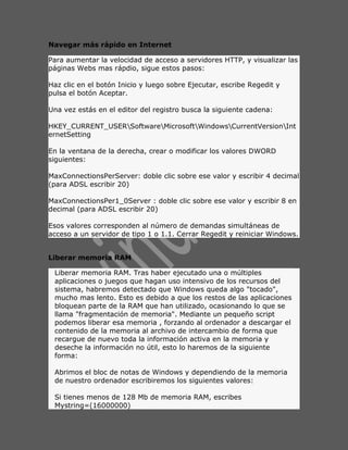 Este documento proporciona varios trucos y consejos para mejorar el rendimiento de Windows XP, incluyendo cómo acelerar el acceso a Internet, liberar memoria RAM, formatear un disco duro en NTFS y mostrar un mensaje personalizado al iniciar Windows XP. También explica cómo comprobar y aumentar la velocidad del disco duro, averiguar qué conexiones tiene el ordenador y desinstalar Windows Messenger.