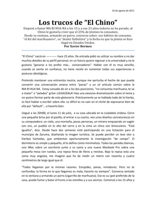 El documento describe una entrevista con "El Chino", un joven de 23 años que ha fumado marihuana desde los 15 años. El Chino habla sobre sus hábitos de consumo, su "kit del marihuanero", cómo obtiene la marihuana de su "dealer futbolista", y sus opiniones sobre los efectos de la marihuana y su ilegalidad.