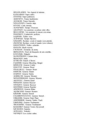Este documento contiene una lista de trucos y códigos para modificar la jugabilidad en el videojuego Grand Theft Auto: San Andreas, incluyendo cambiar el clima, dar a los vehículos habilidades especiales como volar o flotar, y modificar atributos del jugador como la salud, fuerza y habilidades de conducción y combate.