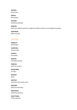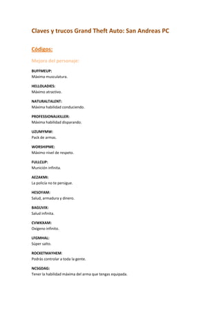 Este documento lista códigos y trucos para Grand Theft Auto: San Andreas en PC. Proporciona códigos para mejorar el personaje, obtener armas y vehículos, controlar el clima y otros efectos. También describe trucos como atraer coches magnéticamente y hacer que las prostitutas persigan a CJ. Finalmente, incluye códigos para Age of Mythology que permiten obtener recursos, unidades y poderes divinos.
