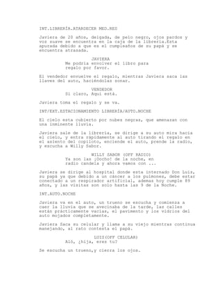 Este documento narra la historia de Javiera, una joven que va a la librería a comprar un regalo para el cumpleaños de su padre Luis, quien se encuentra hospitalizado. Mientras conduce bajo una fuerte lluvia hacia el hospital, Javiera sufre un accidente y despierta mágicamente fuera del hospital. Al entrar, presencia la muerte de su padre. Sin embargo, el espíritu de Luis la consuela, diciéndole que es hora de celebrar juntos.