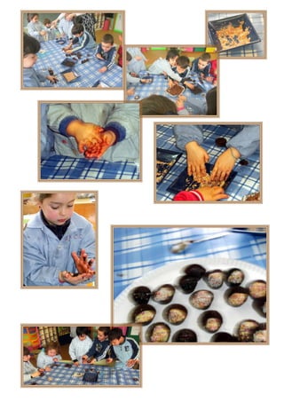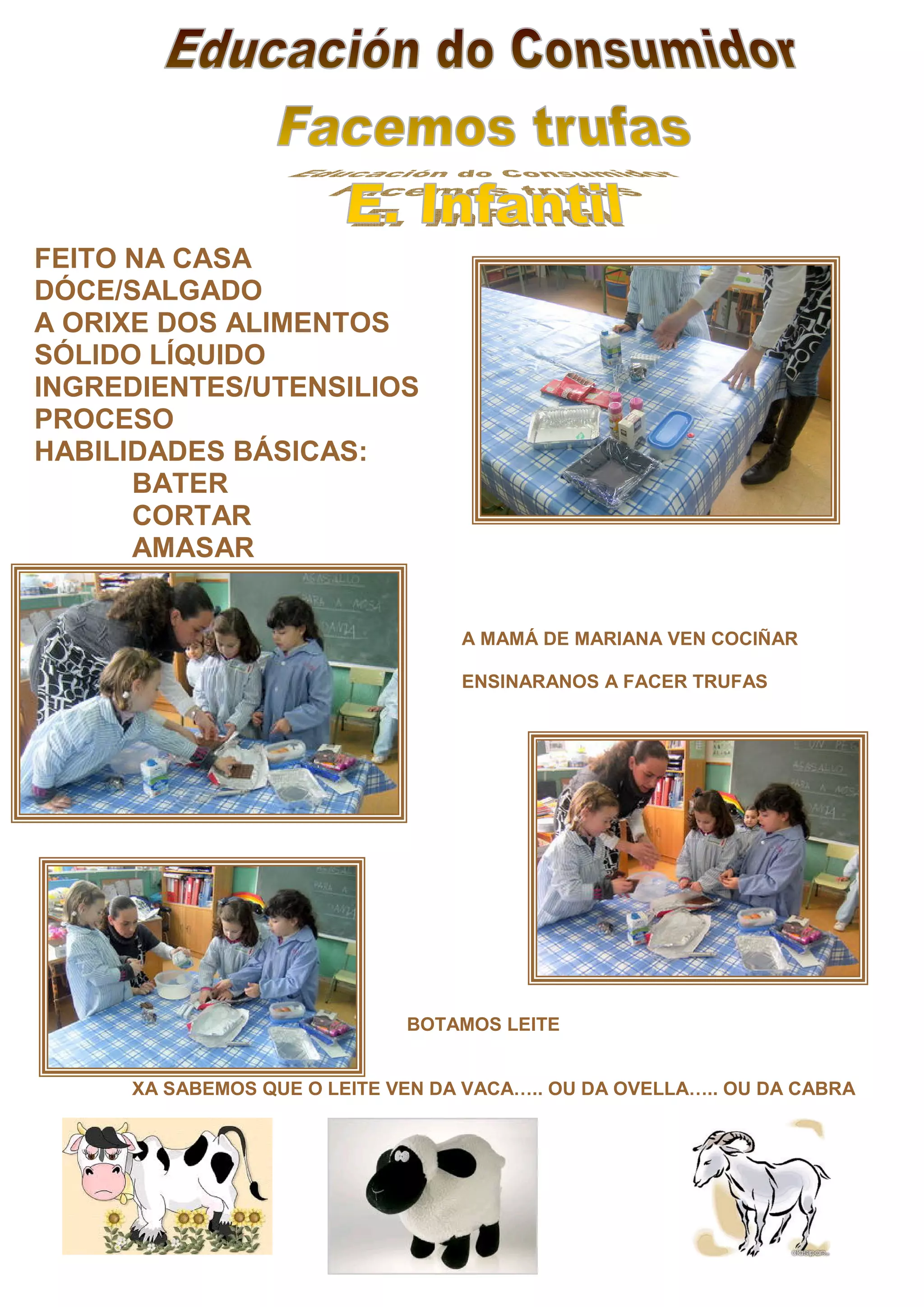 El documento presenta las instrucciones para hacer trufas de chocolate. Explica los ingredientes necesarios como leche, chocolate, mantequilla y huevos. Detalla el proceso de mezclar los ingredientes, calentarlos en el microondas, enfriarlos en el refrigerador y formar bolas que se rebozan en colores o chocolate. Al final, agradece a la cocinera por enseñarles a hacer las trufas.