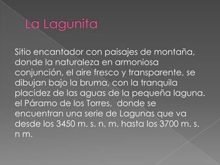 El documento describe el páramo de los Torres, un sitio encantador ubicado entre los estados de Trujillo, Lara y Portuguesa en Venezuela. El páramo contiene una serie de lagunas entre los 3,450 y 3,700 metros sobre el nivel del mar y una vegetación que incluye bosque húmedo y subpáramo. El área también sirve para el abastecimiento de agua a varias represas y embalses en los estados de Portuguesa y Barinas.