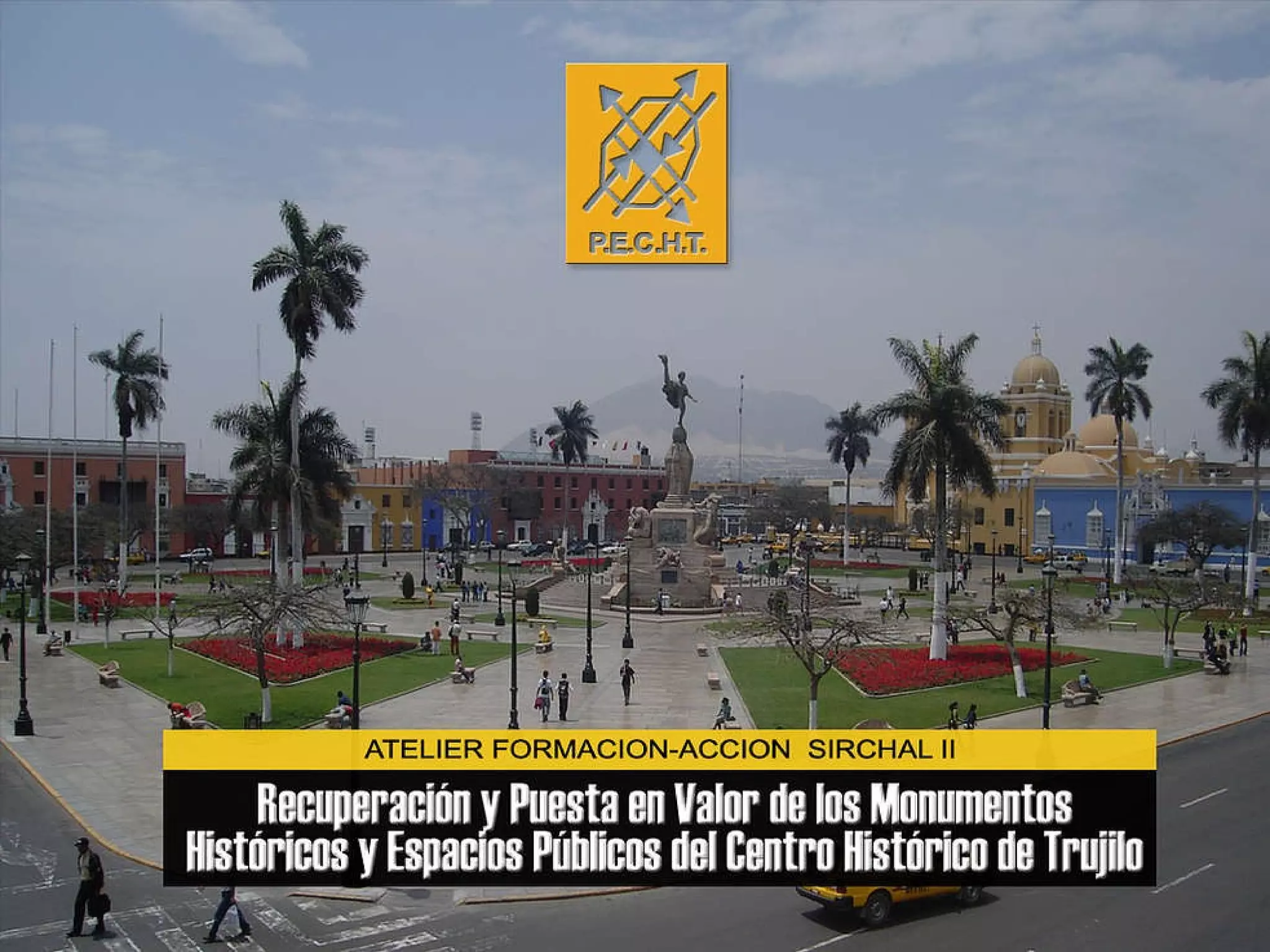 El documento describe un proyecto para recuperar y poner en valor los monumentos históricos y espacios públicos del centro histórico de Trujillo, Perú. El proyecto consiste en la conservación de monumentos en riesgo, la recuperación de espacios públicos, capacitación de recursos humanos, y la creación de un fondo rotatorio para la restauración de monumentos históricos privados. Se espera que el proyecto mejore la calidad de vida de los residentes y aumente el valor de la propiedad mediante la restauración de