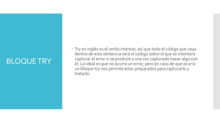 El documento describe los bloques try-catch-finally del sistema de gestión de excepciones en programación. El bloque try contiene el código que puede generar errores y es donde se intenta ejecutar el código. El bloque catch contiene el código para tratar errores capturados en el bloque try. Finalmente, el bloque finally siempre se ejecuta independientemente de si ocurren errores para limpiar recursos.