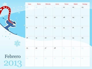 Este documento es un calendario del año 2013 que muestra los días de la semana para cada mes, con notas sobre el cumpleaños de María el 7 de enero y el aniversario de Nuria y Tomás en enero.