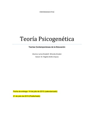 Este documento resume la Teoría Psicogenética de Jean Piaget y su contribución a la educación. Explica los fundamentos de la teoría, los estadios de desarrollo cognitivo, los procesos de aprendizaje como la asimilación y acomodación, y los tipos de esquemas propuestos por Piaget. La autora concluye que la Teoría Psicogenética es una importante contribución a la educación ya que explica cómo aprenden los estudiantes y es fundamental en la práctica docente.