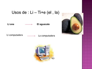 El documento presenta palabras y frases básicas en tsotsil, un idioma maya hablado en Chiapas, México. Explica el uso de partículas como "li" y "ti'e" para artículos definidos e indefinidos, "kusi" para preguntas sobre qué o cuál, y las partículas "oy" y "to" para indicar posesión y tiempo. Además, provee ejemplos comunes con traducciones al español para demostrar el uso de estas palabras y construcciones gramaticales en oraciones cortas.