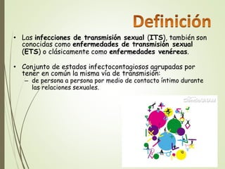 Las infecciones de transmisión sexual (ITS) se transmiten principalmente a través del contacto sexual sin protección y pueden causar una variedad de síntomas. Los agentes causantes comunes incluyen bacterias, virus, hongos y parásitos. Algunas ITS como el VIH/sida y la sífilis pueden tratarse, pero otras como el VPH a menudo no tienen cura. La prevención requiere abstinencia, monogamia o uso de preservativos.