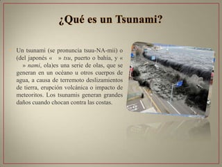 El documento describe los tsunamis, incluyendo sus causas como terremotos y erupciones volcánicas, y varios ejemplos históricos de tsunamis devastadores como el de 2004 en el Océano Índico que mató a unas 230,000 personas. También discute los sistemas de alerta de tsunamis y medidas de prevención para salvar vidas.