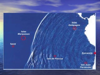 Este documento describe los tsunamis, incluyendo su definición, causas, propagación y efectos. Un tsunami es una gran ola generada por terremotos u otros desastres submarinos que puede viajar rápidamente a grandes distancias. Mientras viaja por el océano puede ser pequeña, pero crece drásticamente en altura al llegar a aguas poco profundas, pudiendo causar gran destrucción. Se propagan a velocidades de hasta 800 km/h, e inundan áreas costeras dependiendo del período y altura de la o