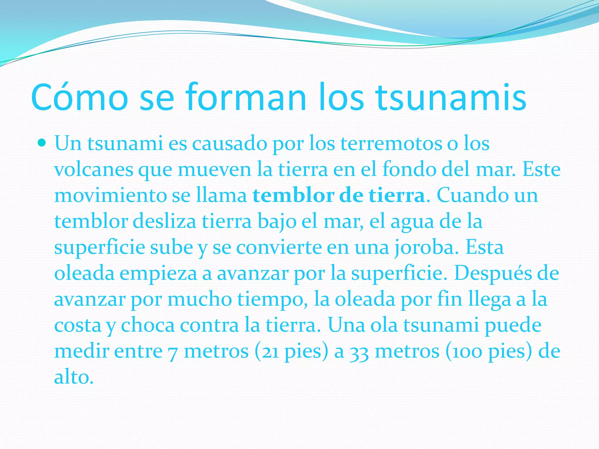 Un tsunami es causado por terremotos o volcanes submarinos que mueven el fondo del mar, creando una ola que puede medir entre 7 y 33 metros de alto. Si se siente un fuerte terremoto cerca de la costa, hay que evacuar a un área alta de al menos 30 metros sobre el nivel del mar dentro de los 20 minutos siguientes, ya que podría llegar un tsunami a una velocidad de más de 100 km/h.