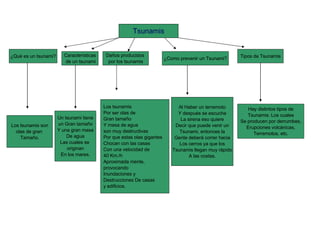Un tsunami es una serie de olas gigantescas generadas por movimientos sísmicos u otros eventos submarinos. Cuando llegan a la costa, los tsunamis pueden alcanzar alturas de 30 metros y avanzar rápidamente, causando inundaciones, destrucción de casas y miles de muertes. Para prevenir daños, es importante alejarse de la costa y dirigirse a zonas altas cuando sucedan terremotos o se observe un retiro anormal del mar.