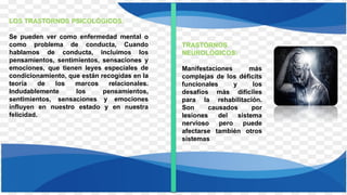 Este documento discute los trastornos neurológicos que afectan a niños en edad escolar. Explica que los trastornos neurológicos son causados por lesiones en el sistema nervioso y pueden manifestarse a través de síntomas como falta de coordinación, debilidad muscular y confusión. Los principales trastornos neurológicos que afectan a niños incluyen discapacidad intelectual, trastornos del espectro autista, TDAH y trastornos específicos del aprendizaje. Estos tra